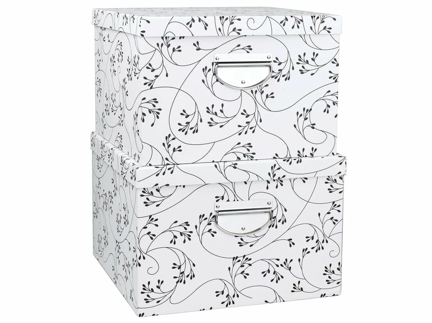 Eine schöne Optik und Stauraum bietet das zweiteilige Aufbewahrungsset „Flowers“ mit schwarzen Blumendekor auf weißem Grund. Deckel und Metallgriffe stehen auch zur Verfügung.