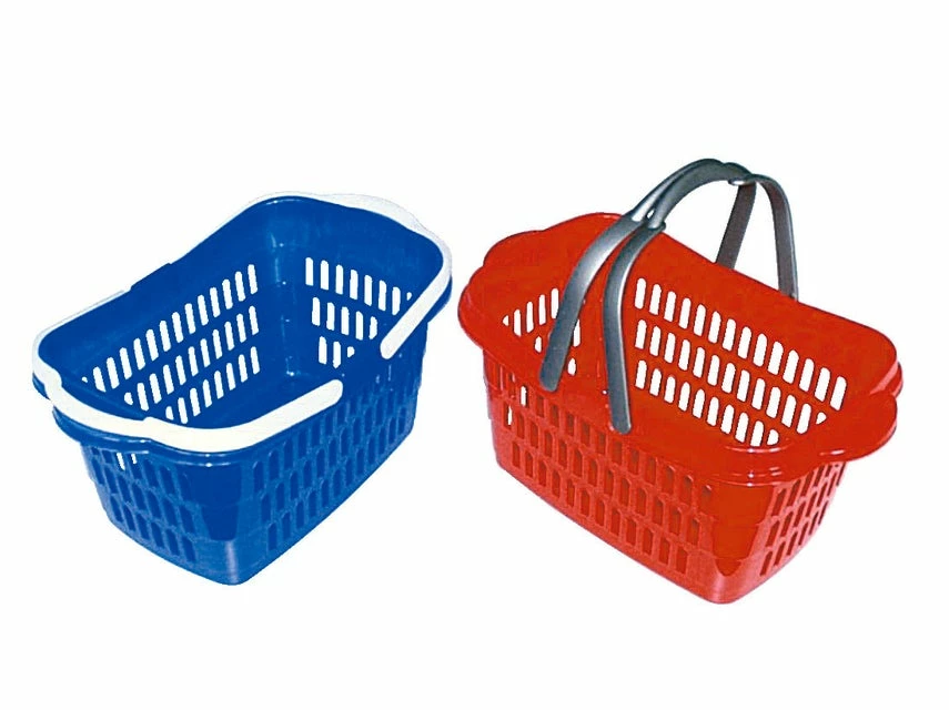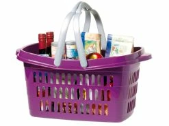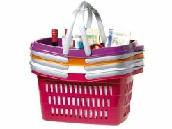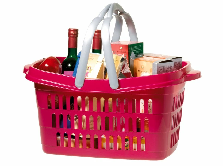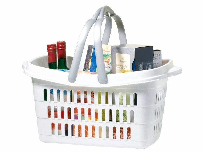Genügend Platz für Ihren Einkauf bietet der Einkaufskorb aus Kunststoff. Er misst 48×28,5×23,5 cm, hat klappbare Tragegriffe und ist in verschiedenen Farben in den Einrichtungshäusern erhältlich.