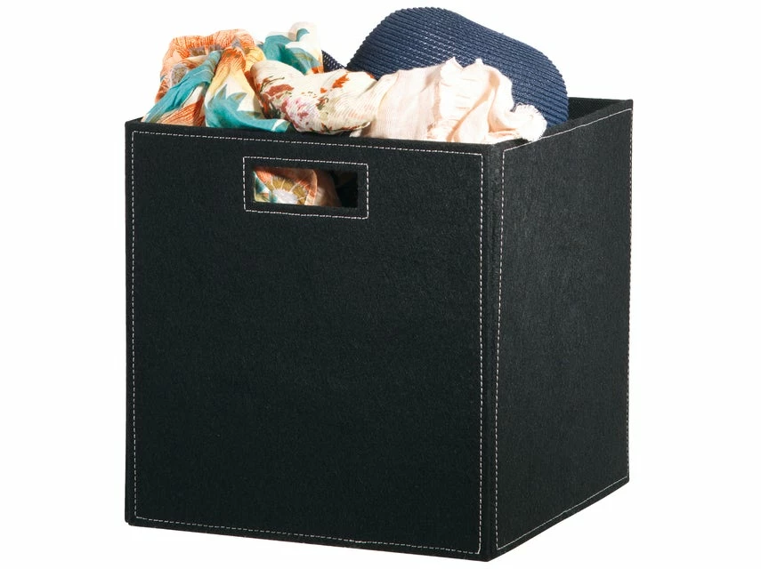 Die schwarze Filzbox mit weißen Nähten dient nicht nur als praktischer Aufbewahrungsort, sondern ist auch ein elegantes Accessoire für Ihren Wohnbereich.
