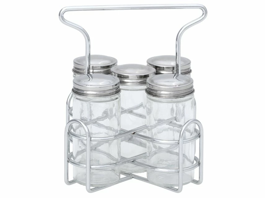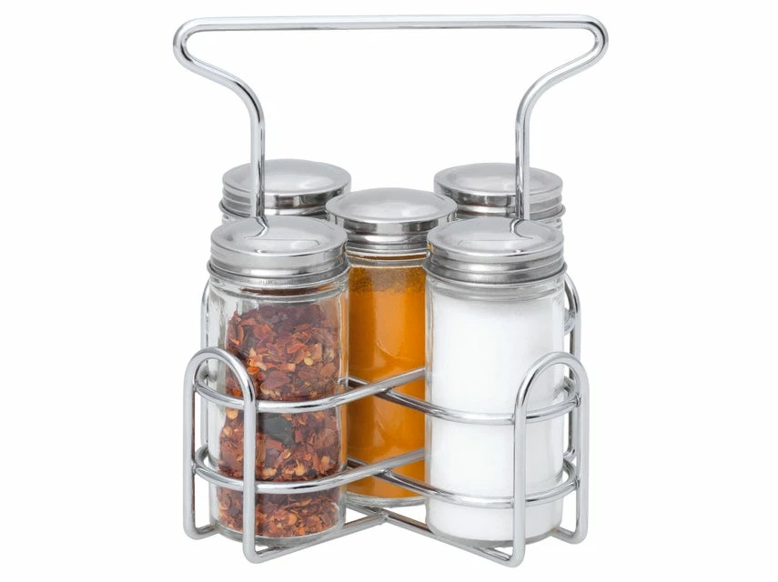 Ein praktischer Küchenhelfer der auch an Ihrem gedeckten Tisch optisch überzeugen kann ist dieser 6-teilige Gewürzständer aus Chrom. Ihre bevorzugten Gewürze und Kräuter finden in den 5 Gläsern Platz. Hinweis: Inhalt ist nicht im Lieferumfang enthalten.