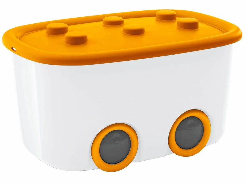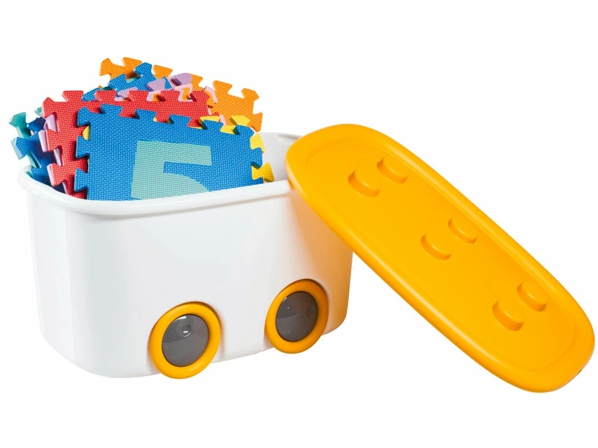 Diese Box ist mit einem Deckel und Rollen ausgestattet.