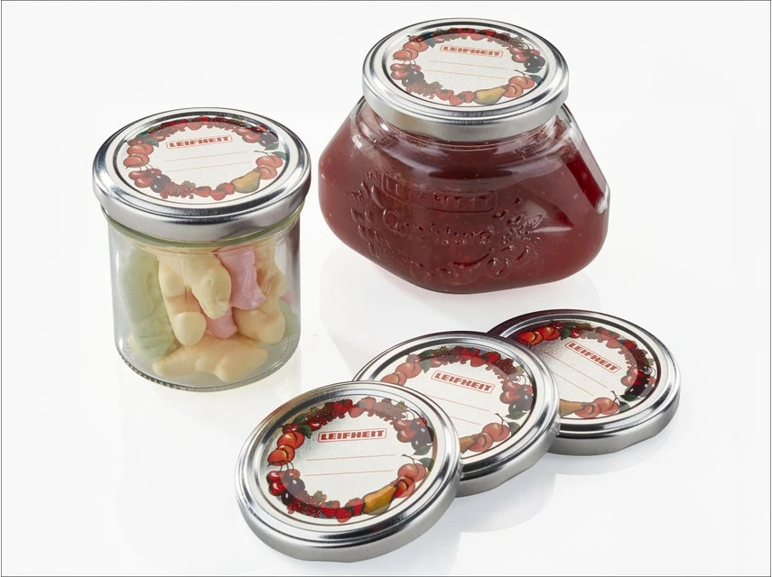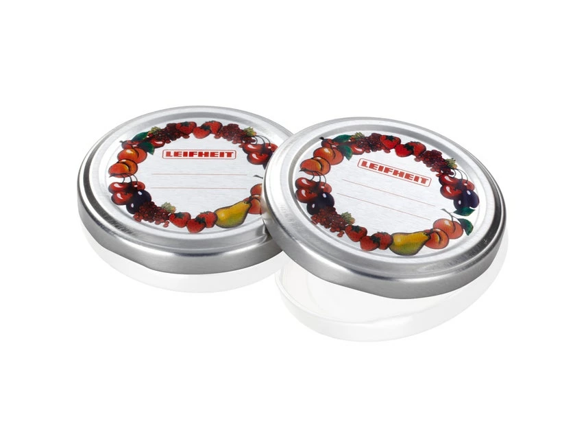 Eine Packung mit 10 Stück Schraubdeckel aus Metall für Marmelade- und Einmachgläser mit einem Schraub-Durchmesser von 66 mm. Die Deckel haben eine Spezialbeschichtung und können individuell beschrieben werden. Eine Packung mit 10 Stück hat die Abmessung von 5/17,5/7,5 cm (B/H/T).