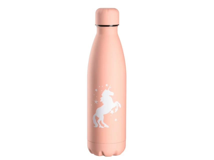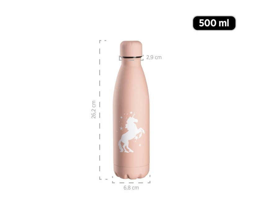 Diese Thermotrinkflasche aus 18/8 Edelstahl der Traditionsmarke Mäser isoliert sowohl Ihre Heißgetränke als auch Ihre Kaltgetränke zuverlässig! Doppelwandig ausgeführt mit isolierendem Vakuum bietet diese Sportflasche eine ausgezeichnete Wärme- und Kälteisolation. Mit einer Füllmenge von 500ml ist die auslaufsichere Thermo Trinkflasche ideal geeignet, um auch unterwegs und beim Outdoor Sport nicht auf perfekt temperierte Getränke verzichten zu müssen. Dank der praktischen, leicht gummierten mattfarbenen Oberfläche liegt die Vakuumflasche fest in Ihrer Hand und bietet auch Kindern den nötigen Grip. Das im Brennofen ausgehärtete Einhorn-Motiv macht diese Flasche zum idealen Wegbegleiter für Kinder und Einhorn-Fans. Freuen Sie sich auf diese – ganz nach Belieben kühlende oder wärmende – Iso Flasche in bewährter Qualität der Traditionsmarke Mäser.