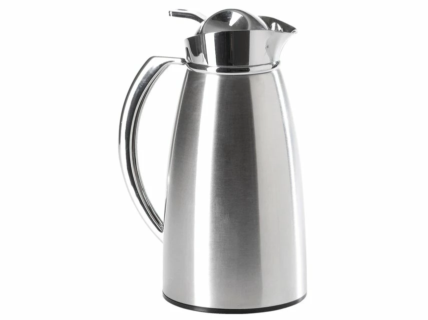 Hochwertig präsentiert sich die Thermoskanne aus chromfarbig glänzendem Metall. Kaffee & Tee bleiben in dieser Thermoskanne auch über einen längeren Zeitraum perfekt temperiert und können direkt aus der formschönen und durchaus „tischtauglichen“ Kanne serviert werden. Die Füllmenge beträgt 1 Liter.