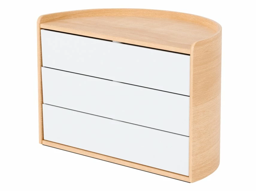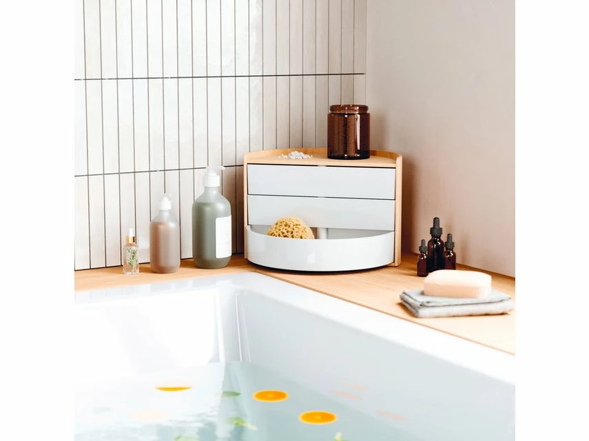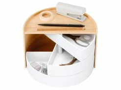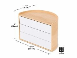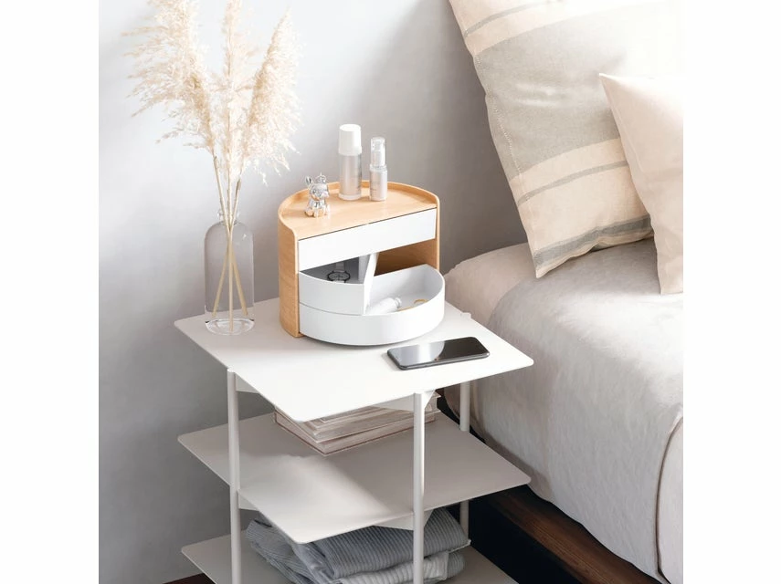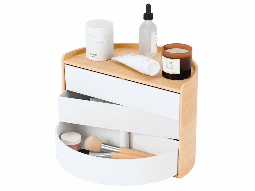 Funktional und dekorativ zugleich ist die Aufbewahrungsbox Moona. Die drehbaren Schubfächer können herausgezogen werden und dienen zum Verstauen von Schminksachen uvm. Auf der Präsentationsplatte finden kleine Accessoires, Parfüm, kleine Pflanzen oder andere Gegenstände ihren Platz.
