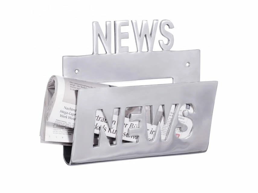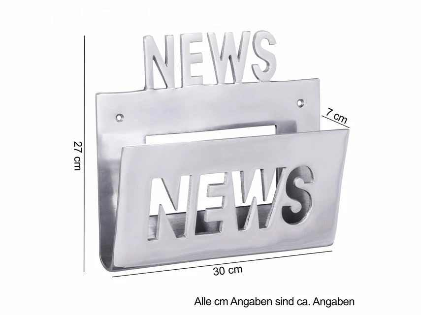 Design Ein echter Blickfang: Ein Deko Zeitungshalter aus Aluminium Schriftzug News – optisches Highlight Hochwertige Verarbeitung Großes Ablagefach Abmessungen Breite: 30 cm Höhe gesamt: 27 cm Tiefe Ablagefach: 7 cm Abstand zwischen Löchern: 24,5 cm Farbe Silber Besonderheiten Gefertigt in Handarbeit Jeder Artikel ein Unikat Löcher für Wandhalterung bereits vorhanden Material Aluminium Lieferumfang 1 Zeitungshalter Montagematerial nicht im Lieferumfang enthalten, da von Wandbeschaffenheit abhängig Lieferung ohne Dekoration Montage Lieferzustand: Montiert Kein Aufbau erforderlich