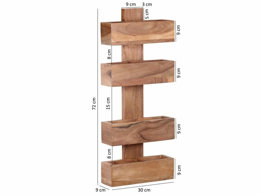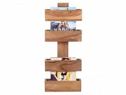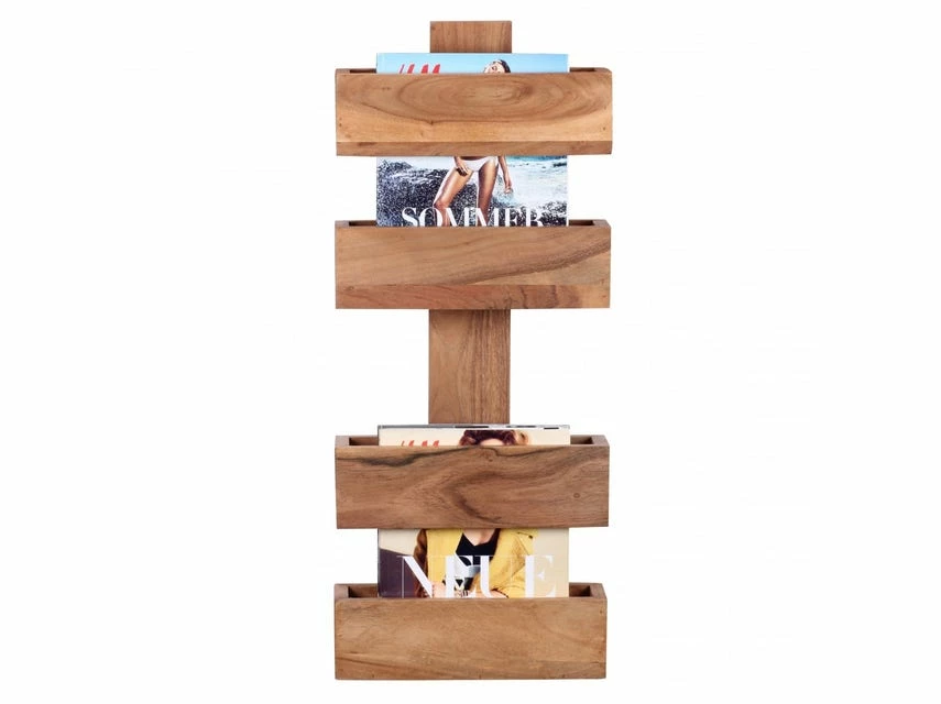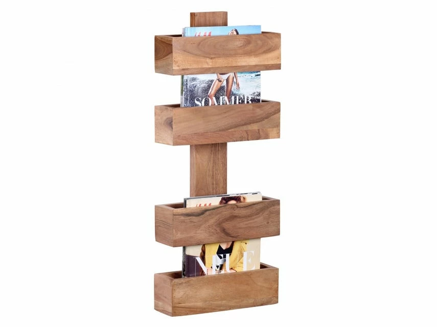 Wofür geeignet? Der Zeitungsständer lässt sich im Wohnzimmer als zusätzliche Ablage platzieren – Ideal geeignet für Warteräume – Montagematerial für Wandhalterung inklusive FSC® zertifizierte Ware: Bei dem Material handelt es sich um FSC® zertifizierte Ware aus verantwortungsvollen Quellen. Es wird besonderen Wert auf die Nachhaltigkeit bei den verwendeten Materialien gelegt. Beim Kauf dieses Produktes unterstützen Sie somit das Bestehen der Wälder. Pflegehinweise: Die Oberfläche mit einem lauwarm angefeuchteten Baumwolltuch reinigen Keine Scheuermittel, scharfe Reinigungsmittel oder tropfnasse Tücher verwenden Keine weitere Behandlung der naturbelassenen Oberfläche (Ölen, Wachsen) notwendig Design Moderner Zeitungsständer in klassischem Design Stilvolle Maserung sorgt für warmes Ambiente 2 Ablagefächer und 2 Halterungen Abmessungen Tiefe: 10 cm Höhe: 72 cm Breite: 30 cm Zeitungsfach innen oben: 27 x 6 x 9 cm Zeitungsfach innen (2. von oben): 27 x 6 x 8 cm Zeitungsfach innen (2. von unten): 27 x 6 x 9 cm Zeitungsfach innen unten: 27 x 6 x 8 cm Abstand Aufhängung: ca. 40 cm Materialstärke Zeitungsfach: 1,5 cm Farbe Akazie Besonderheiten: Gefertigt in Handarbeit Jeder Artikel ein Unikat Inklusive Montagematerial zur Wandbefestigung Material Akazie Massivholz Da es sich um Handarbeit und um ein Naturprodukt handelt kann es zu Farbabweichungen oder Unebenheiten kommen Lieferumfang 1 Zeitungsständer Montagematerial für Wandhalterung Lieferung ohne Dekoration Montage Lieferzustand: montiert