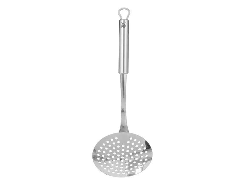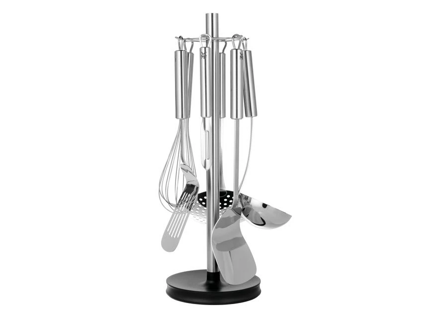 Das klassische Küchenhelfer-Set von WMF für Profis ist 7-teilig und besteht aus 1x Utensilienständer, 1x Schöpflöffel, 1x Schaumlöffel, 1x Wokwender, 1x Wender, 1x Schneebesen, 1x Gemüseschäler. Die einzelnen Bestandteile hängen an einem Ständer und können so bequem in der Küche platziert werden und sind jederzeit griffbereit. Das komplette Set ist aus rostfreiem Cromargan Edelstahl 18/10 teilmattiert und einer Standplatte aus hochwertigen Silikon. Es ist besonders für Langlebigkeit gedacht und daher rostfrei, spülmaschinengeeignet, formstabil, hygienisch, säurefest und unverwüstlich. Die Funktionsteile sind fest im Griff einzementiert. Mit praktischer Öse zur Aufbewahrung an der Hängeleiste.